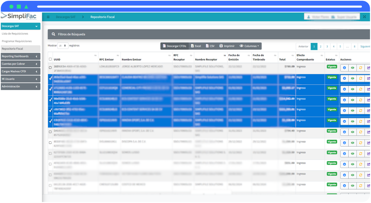 SimpliFac es la herramienta para descarga masiva de CFDI desde el SAT que te permite automatizar la gestión y validación de tus facturas electrónicas.